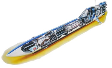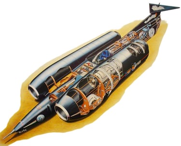 My next work of art was a cutaway of Richard Brown’s rocket bike, Mach 3 Challenger. This was used as a poster to help raise funds for the project, and it was also the last cutaway I did using a paintbrush and airbrush.