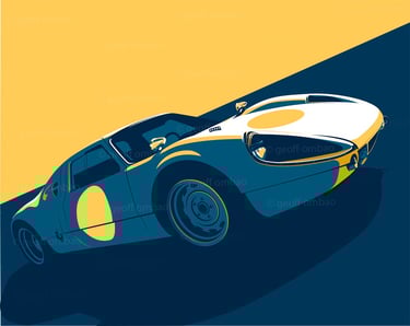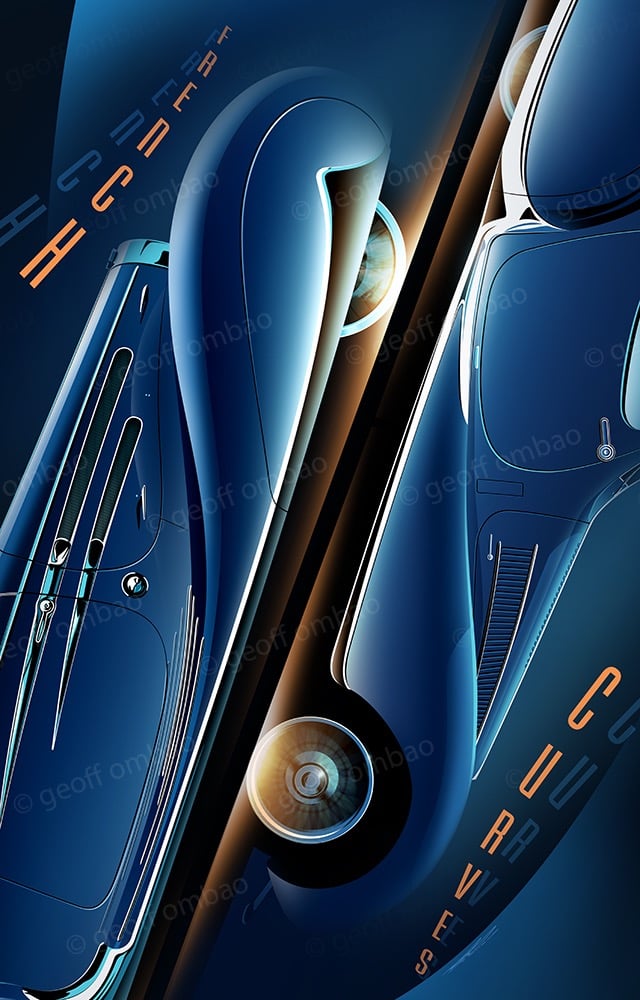 GO: As I had mentioned earlier, I’ve been moving towards making my images less about the car, and more about a mood, environment, or about the composition itself. I think “French Curves” is one of my more successful examples of this idea. Here, the image isn’t about a specific car… rather, it’s about the voluptuous curved forms found in iconic Art Deco cars. So rather than featuring one car, I rendered two. Then, I zoomed in on the forms that I wanted to celebrate, and positioned them in a way that would encourage the eye to move between them. I also used type to add some playfulness and dimension to the composition.